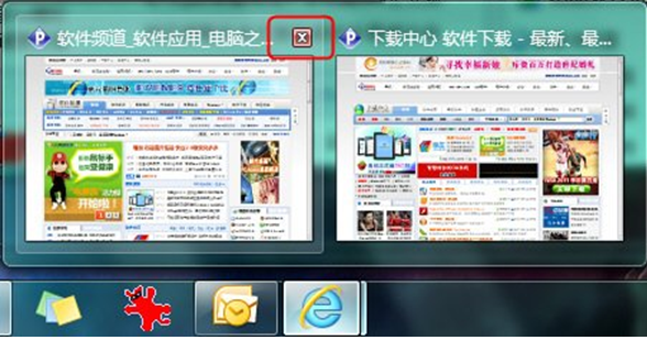 另外,中键点击不仅能快速打开窗口,还可以快速关闭窗口。Windows 7任务栏开启Aero特效后,诸如IE等程序打开多个标签/窗口后,可以通过它来查看各个窗口的缩略图预览,也许用户会留意到当鼠标移动到某个缩略图时,右上角会显示一个类似关闭的小按钮,可以直接点击关闭窗口或标签。