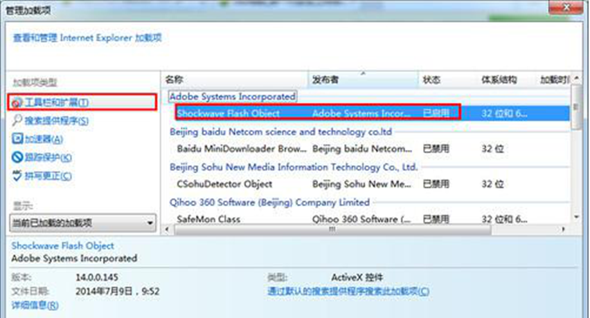 2、Flash插件问题:查看浏览器中是否开启了Flash插件或是没有安装,及时将最新的Flash插件开启或安装即可。