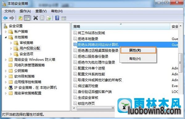 步骤8、返回到本地安全策略页面,找到”拒绝从网络访问该计算机“→”右键“→”属性“。
