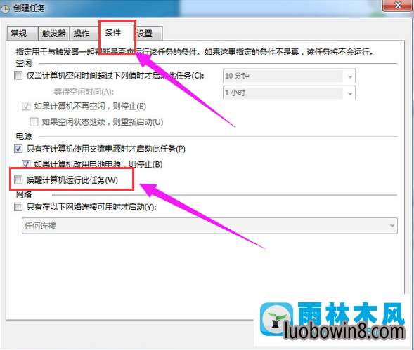 点击“条件”选项卡,勾选“唤醒计算机运行此程序”