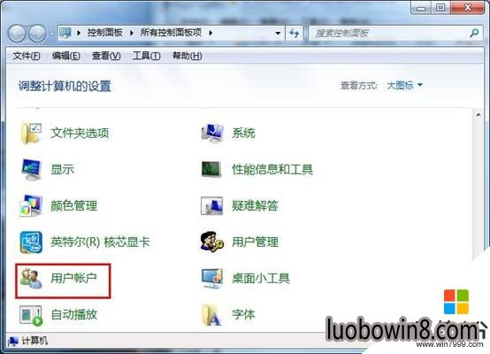 2、打开控制面板窗口后,点击“用户帐户”,如下图所示: