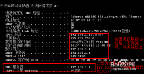 Windows键+R键------出现“运行”窗口------输入“cmd”----按回车键---出现“命令提示符”对话框-------输入“ipconfig/all”回车查看是否获取到了DNS相关信息,如图,获取的dns为路由器代理dns 192.168.1.1,如果这里没有获取到dns可以在自己电脑网卡上设置一个dns,一般每个地区dns不相同这个可以咨询当地运营商,也可以填写8.8.8.8或者114.114.114.114等免费dns。