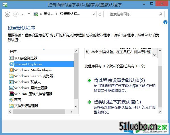4、点击【internet Explorer】→【选择此程序的默认值】;